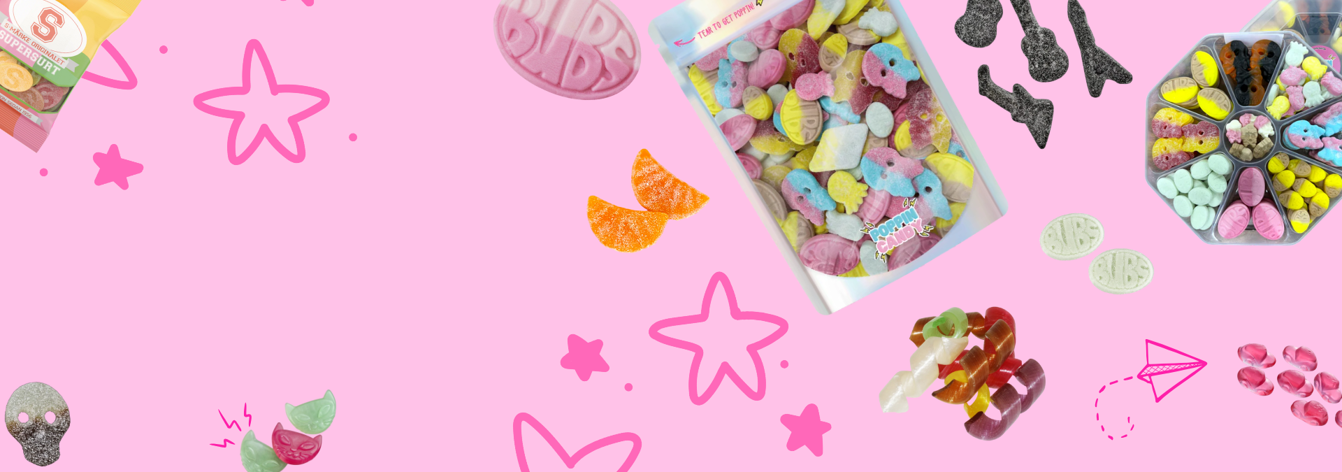Imported candy from Sweden, Denmark, Norway and Finland, in countless varieties, all shipped across the world. You'll find sour gummies, fruity chews, foam sweets, jelly-filled bombs and proper Scandinavian licorice from brands like Bubs, Malaco and Fazer, plus harder-to-find Nordic pick 'n' mix that you don't see every day.